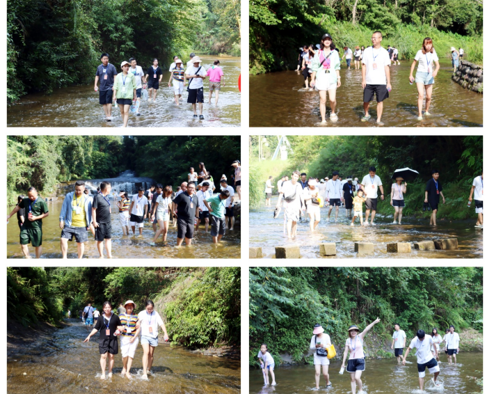 團隊成員一行從觀沱下渡下船后,經(jīng)過1公里山間林蔭小道,開啟長略7公里的“中國最長石板河”踩水體驗:大家欣然下水后發(fā)現(xiàn),石板河一石沉底,托起淺淺清流,或急速、或緩流、徐徐下行、人水合一、動態(tài)接觸,讓人全新體驗感十足;兩岸奇峰夾峙、林木森森,成就天下石板河之絕唱。大家先后經(jīng)過一碗水、一顆松、碧水長灘、響灘子瀑布、出谷食坊、水簾飛虹、水舞山間、戲水戰(zhàn)場等景點,在溯溪戲水的樂園、避暑游樂的天堂中,讓人縱情山水,盡享水趣。然后,乘坐體驗飛天魔毯穿越叢山峻嶺之間,遙望七彩玻璃水滑道的蜿蜒飛馳,感受大自然鬼斧神工和天下穹隆的瑰麗之美。